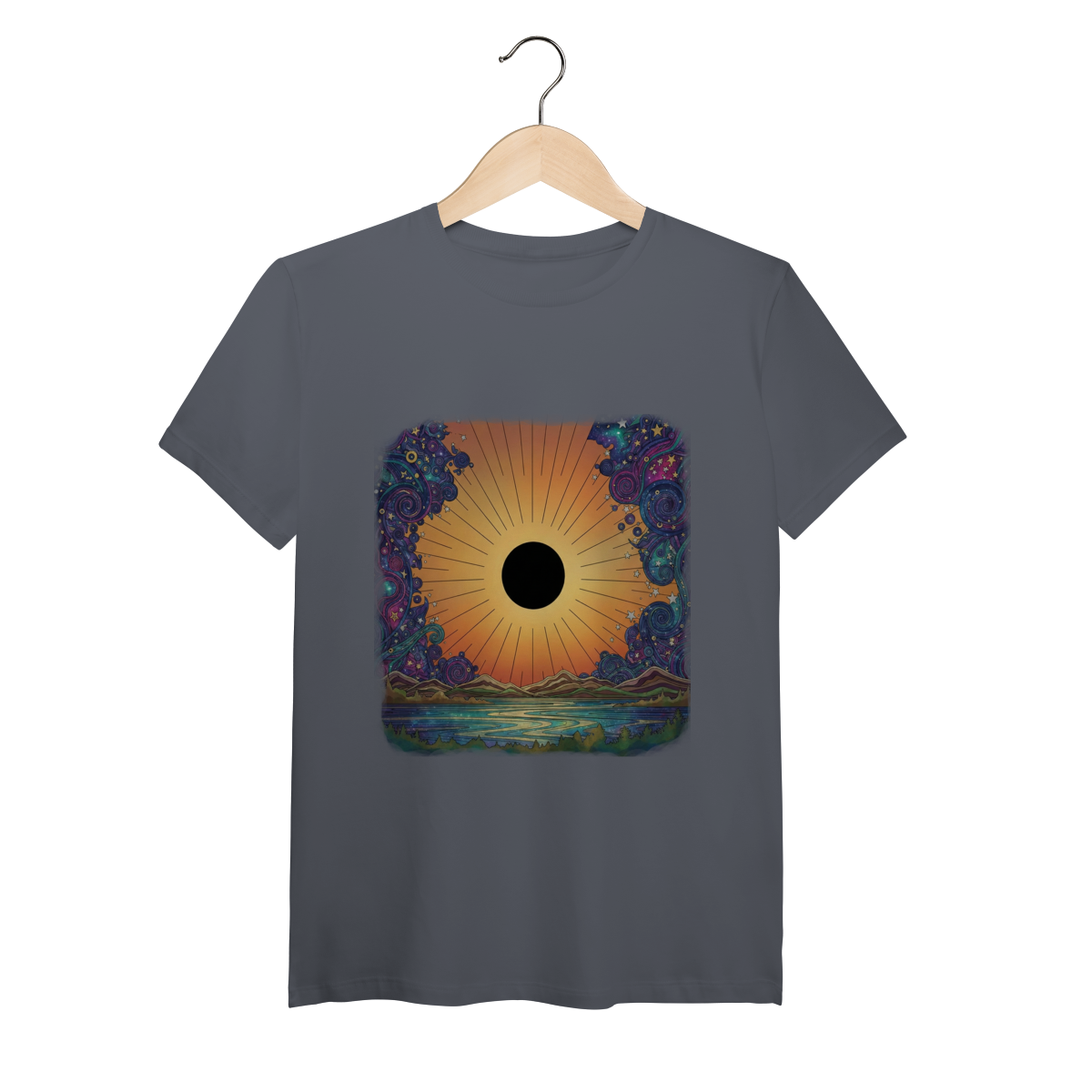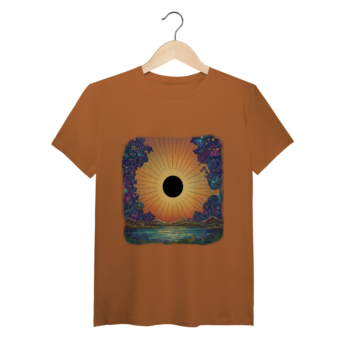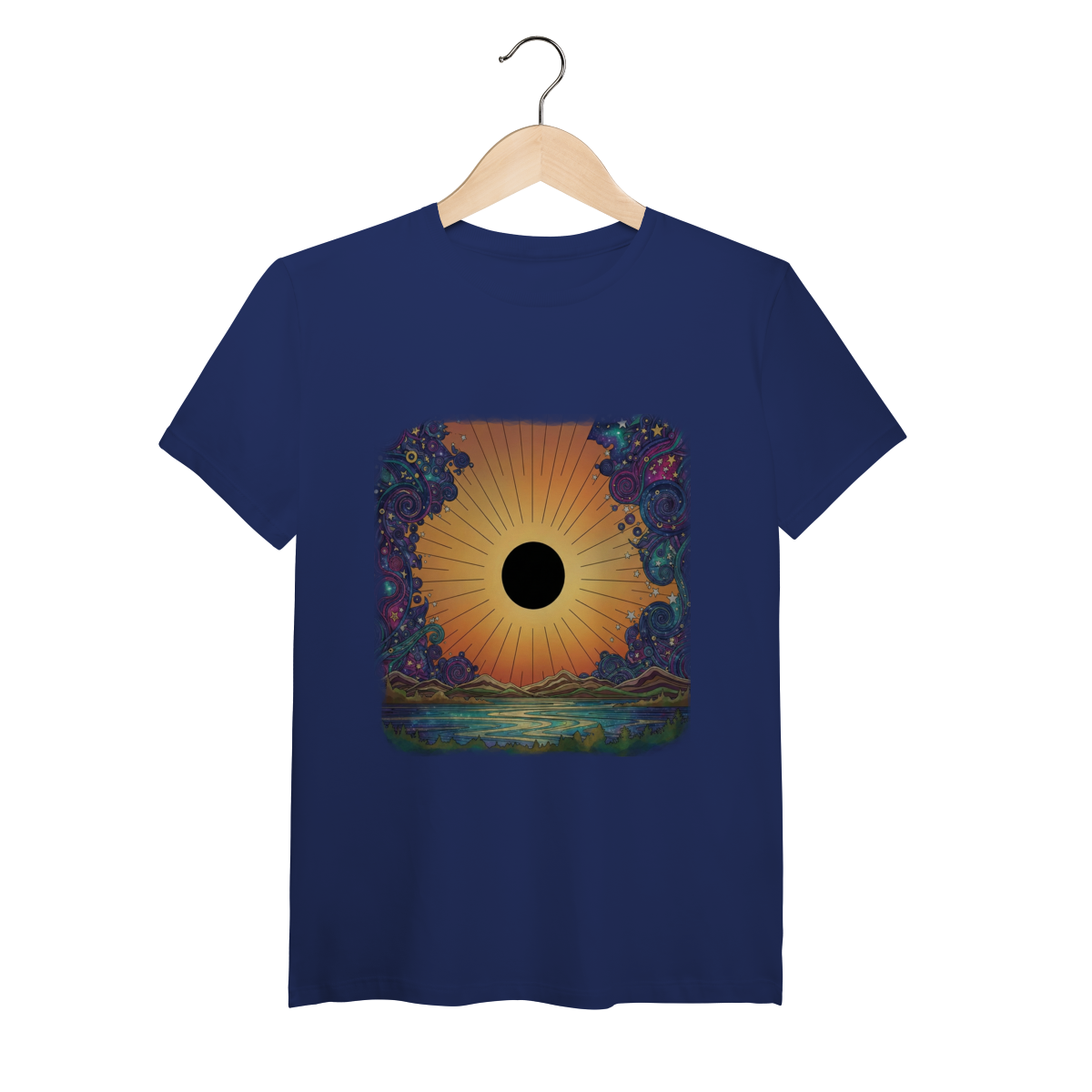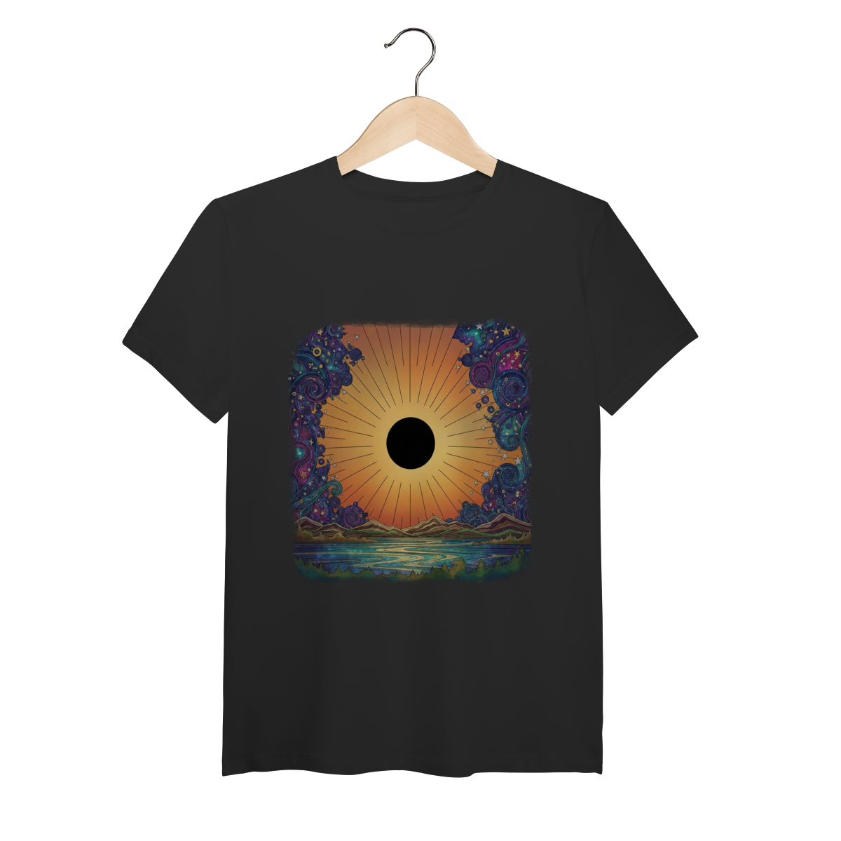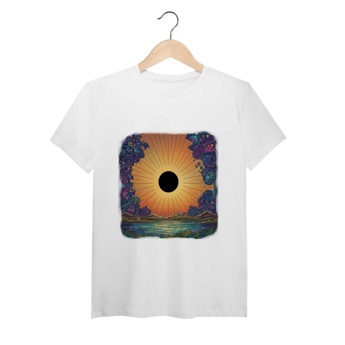 No horizonte do Planeta Aurea, a luz não luta contra a escuridão; ela a integra. Esta estampa captura o momento exato dessa "Alquimia Cósmica". O disco solar central, em preto absoluto, representa o núcleo inexplorado do ser — a sombra, o mistério. Ele não está escondido, mas sim gloriosamente emoldurado por um degradê quente e vibrante de pôr do sol, que transita de laranjas profundos a amarelos suaves, simbolizando o despertar da consciência que abraça tudo o que somos. Nas bordas, o caos do universo é representado por espirais cósmicas e nebulosas em tons frios de azul e roxo, que agora dançam em harmonia ao redor desse novo centro de gravidade. Vestir The Eclipse Horizon é aceitar que a sua maior luz nasce do reconhecimento da sua própria escuridão.