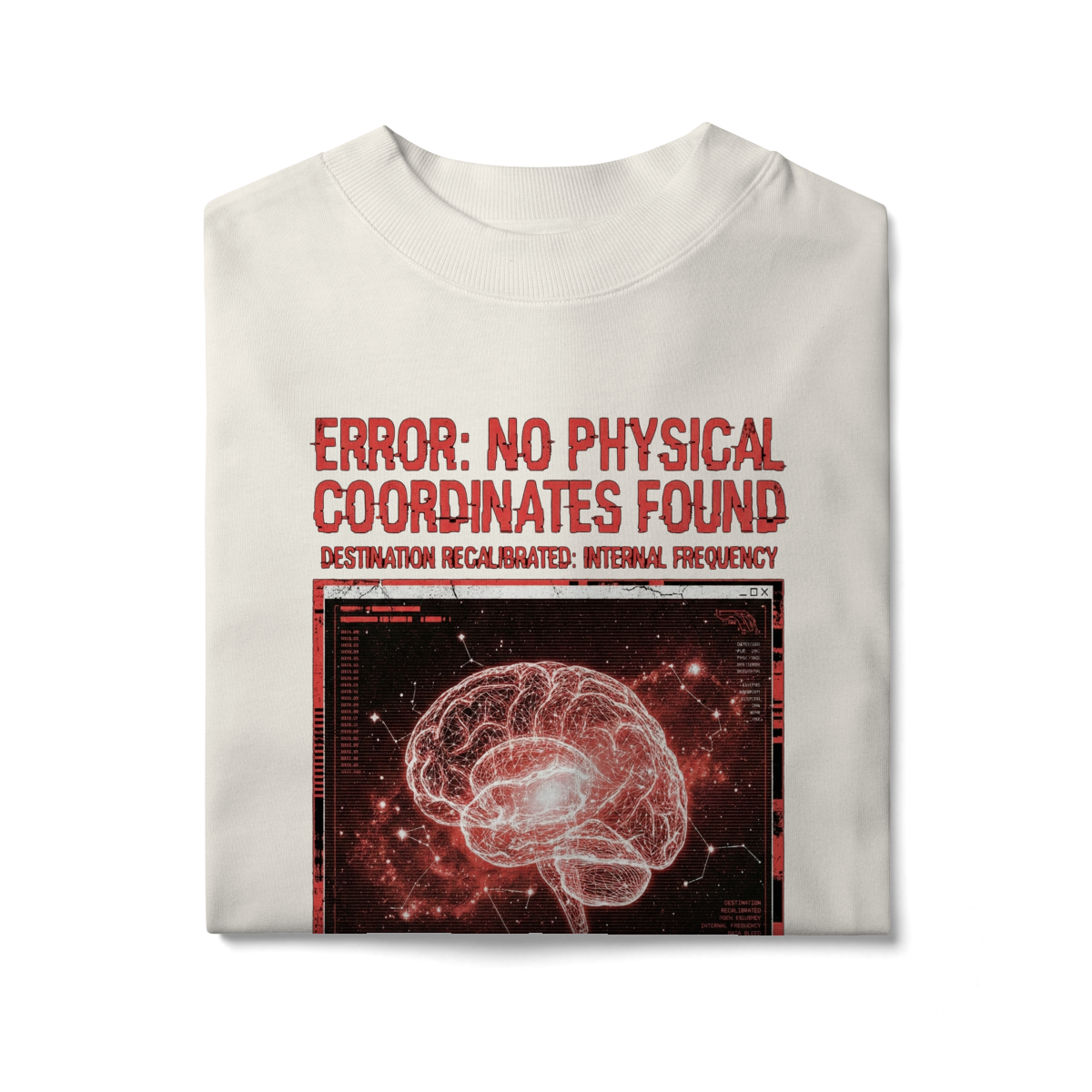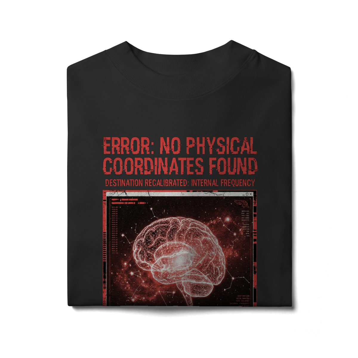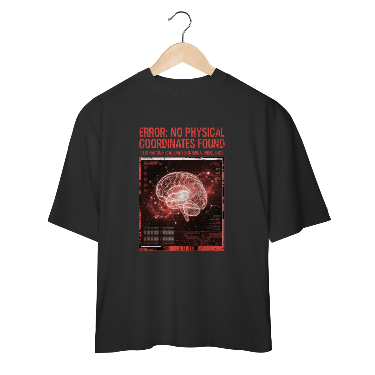 Inspirada no momento exato em que os sistemas de navegação colapsam no vácuo, a T-Shirt Glitch Protocol representa a ruptura com o mundo exterior. Feita em malha heavyweight para suportar a turbulência da rotina, ela traz a estética do erro digital fundida com a anatomia humana.